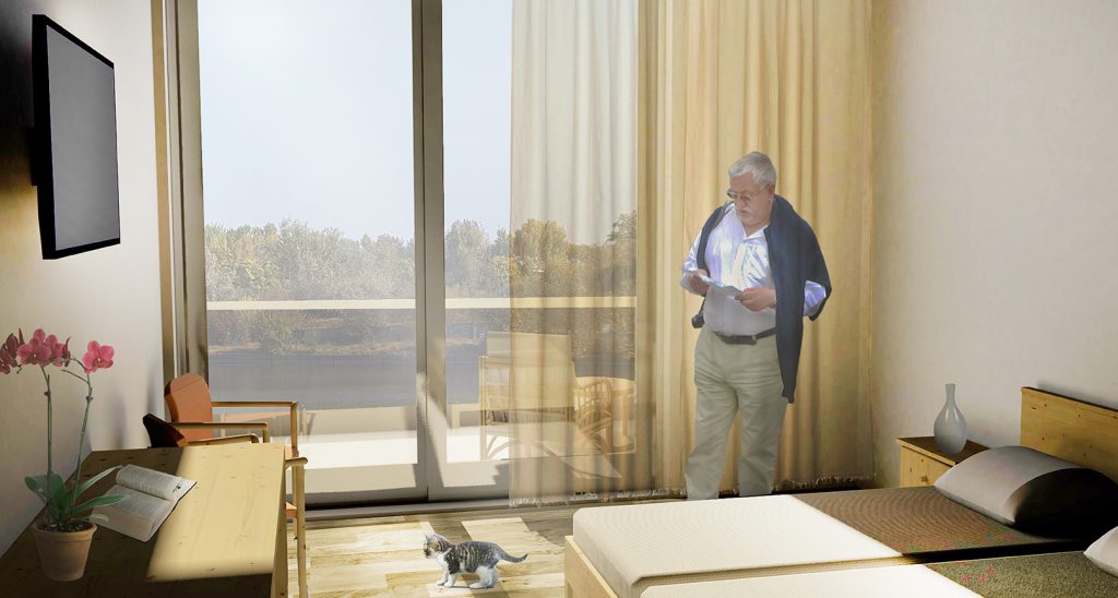 Din punct de vedere funcțional, ansamblul cuprinde 2 zone de cazare cu specific diferit (locuire permanentă și locuire temporară tip spital), cabinete medicale, sală pentru fizioterapie, mici spații comerciale, ateliere, bibliotecă și sală de evenimente și spații servante aferente. Pe lângă acestea, in incintă este amplasată o grădiniță, răspunzând astfel lipsei unei astfel de funcțiuni în imediata vecinătate și creând astfel un cadru favorabil întâlnirii diverselor generații.