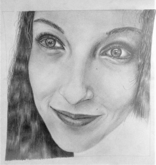 4) After the face itself is done, here comes the most challenging part of the portait – drawing the hair of the subject. It IS challenging mainly because of its duration, of its difficulty and also of the large area of paper you must draw on at this step. At times, it may be hard to keep focused on every single hair and the light reflexion. But, after a while, here comes the result…